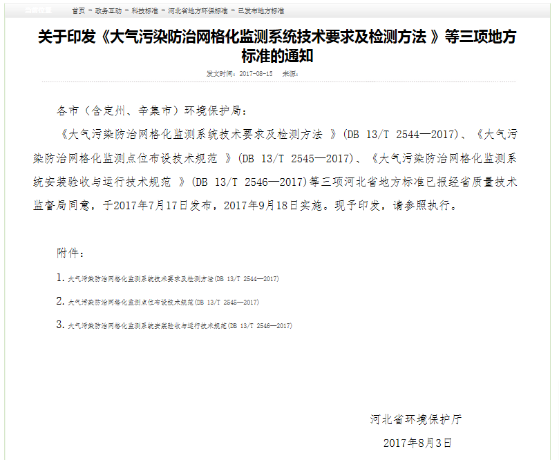 近日,河北省環(huán)境保護廳正式發(fā)布公告,印發(fā)《大氣污染防治網(wǎng)格化監(jiān)測系統(tǒng)技術(shù)要求及檢測方法》、《大氣污染防治網(wǎng)格化監(jiān)測點位布設(shè)技術(shù)規(guī)范》、《大氣污染防治網(wǎng)格化監(jiān)測系統(tǒng)安裝驗收與運行技術(shù)規(guī)范》三項河北省地方標準。標準將于2017年9月18日正式實施,是我國首批網(wǎng)格化監(jiān)測系統(tǒng)地方標準。