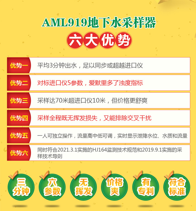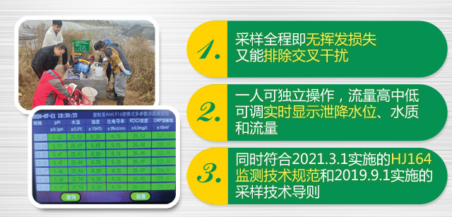 AML919地下水定深取樣器采用氣囊泵采樣,是針對地下水中揮發(fā)性有機物(VOCs)和半揮發(fā)性有機物采樣而專門設(shè)計生產(chǎn)的一款地下水采樣器,氣囊泵地下水采樣器可根據(jù)井深、采樣水層調(diào)整采樣深度,按照設(shè)定液位泄降高度和水質(zhì)判定指標進行自動采樣,當實際液位泄降高度超過設(shè)定液位高度時,采樣器停止采樣;若實際液位泄降高度一直高過設(shè)定液位高度,采樣器則按設(shè)定的時間間隔將定量水樣從地下水環(huán)境監(jiān)測井采集到多參數(shù)水質(zhì)測定儀中,自動判定洗井是否結(jié)束,根據(jù)實驗室檢測需要采集樣品。