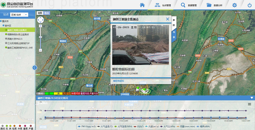 堆料場揚(yáng)塵自動(dòng)監(jiān)測站聯(lián)網(wǎng)管理系統(tǒng)默認(rèn)加載地區(qū)為中心的地圖,地圖類型分為普通地圖和混合地圖,地圖上方為系統(tǒng)功能導(dǎo)航菜單,左側(cè)圍市、站點(diǎn)導(dǎo)航菜單樹。通過左側(cè)導(dǎo)航樹可以直觀的查看當(dāng)前區(qū)域的所有站點(diǎn)情況。點(diǎn)擊區(qū)域、站點(diǎn)名稱可以將地圖縮放到對(duì)應(yīng)的區(qū)域、站點(diǎn),并可以直觀的看到所屬的站點(diǎn)以及信息。堆料場揚(yáng)塵自動(dòng)監(jiān)測平臺(tái)可實(shí)現(xiàn)子站參數(shù)(顆粒物濃度或噪聲)超標(biāo)后中心站警示及抓圖功能。